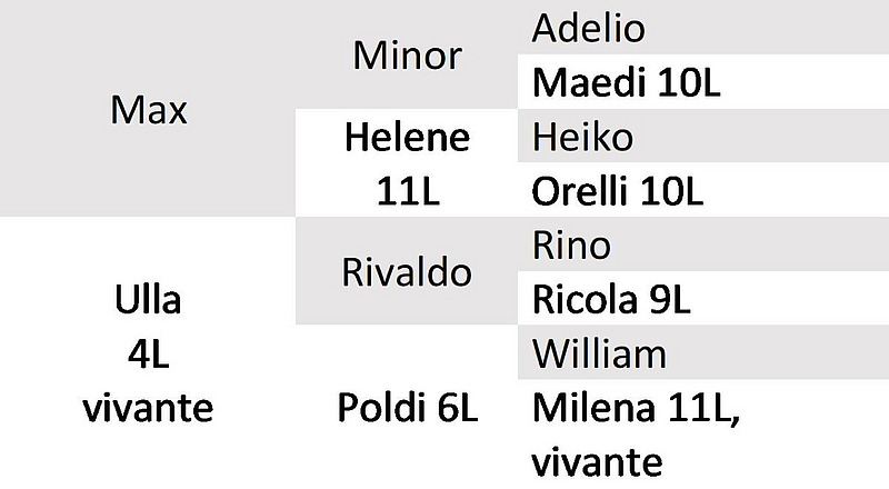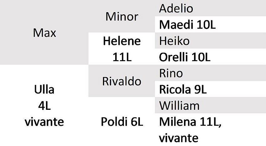 D'excellents ancêtres: La grand-mère Poldi (EX95) a été Miss-OB à l'exposition Tier+Technik 2020 et a également obtenu le titre de vice-beau-pis. Lors de l'exposition cantonale du jubilé BE 2019, elle a également été Miss et a obtenu le titre de vice-beau-pis. L'arrière-grand-mère Milena (EX94) a été Miss-OB à l'Olma 2016.
